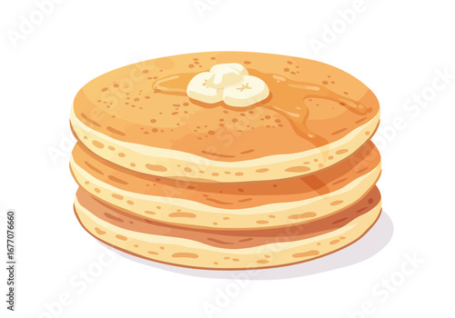 A stack of three pancakes with butter and syrup on top isolated on a white background illustration