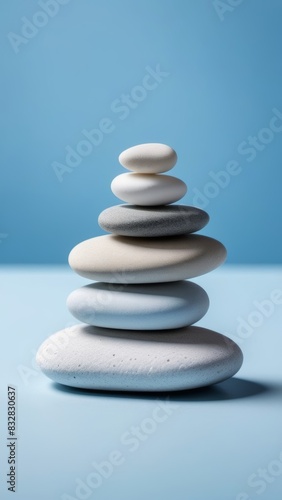 A stack of white and gray rocks on a beach. The rocks are arranged in a pyramid shape, with the largest one at the bottom and the smallest one at the top. Concept of stability and balance