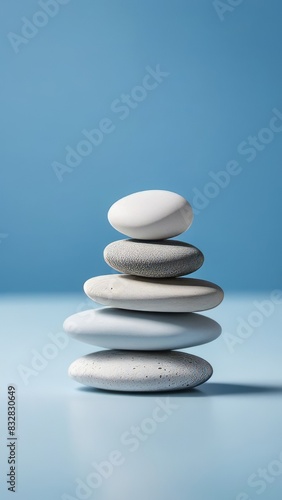 A stack of white and gray rocks on a beach. The rocks are arranged in a pyramid shape, with the largest one at the bottom and the smallest one at the top. Concept of stability and balance