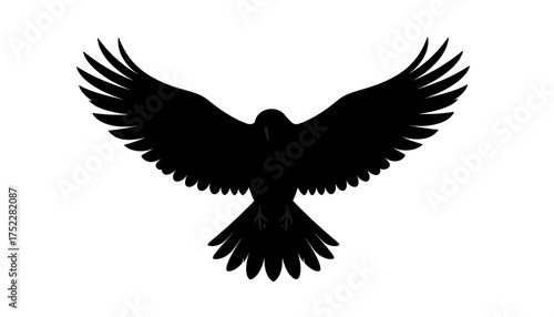 A stark, silhouette of a bird with outstretched wings. It's a symmetrical design against a white background. The bird's body is central