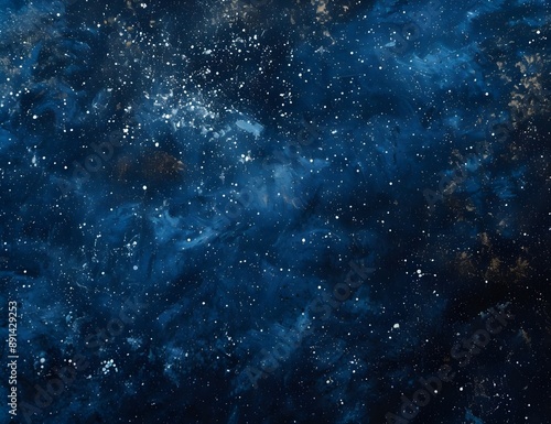 A starry night sky, with stars twinkling in the dark blue background. The overall tone is deep and mysterious, with small details of various celestial bodies scattered across it.