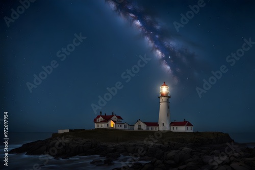 A starry sky above a lighthouse with stars reflecting off the ocean and the lighthouses