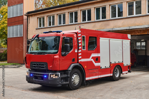 A state-of-the-art firetruck, equipped with advanced rescue technology, stands ready with its skilled firefighting team, prepared to intervene and respond rapidly to emergencies, ensuring the safety