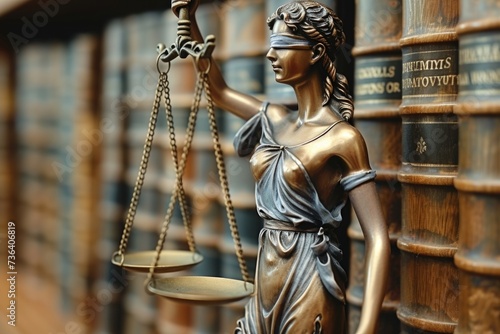 A statue of Lady Justice holding scales, with a backdrop of law books, highlighting the legal theme.