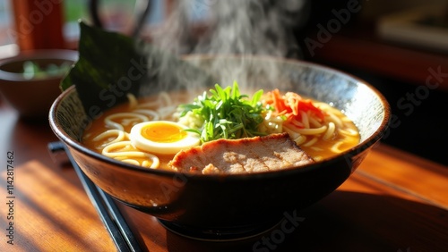 A steaming bowl of authentic Japanese ramen with rich broth, sliced pork, soft-boiled egg, and vibrant toppings in a traditional setting
