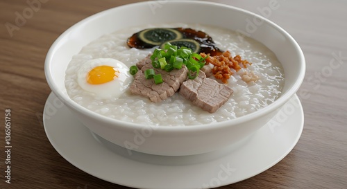 A steaming bowl of congee with century egg and pork on a white plate.