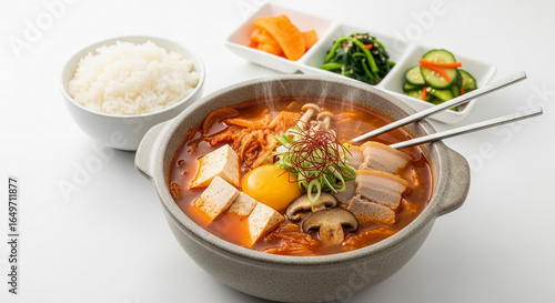 A steaming bowl of Korean Kimchi Jjigae with rice and side dishes, featuring tofu, pork, and a raw egg yolk.
