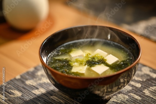 A steaming bowl of miso soup rests on a childs placemat at the dining table. The soup features tofu cubes and seaweed, creating a warm, inviting meal perfect for any time of day