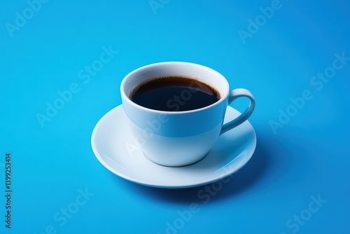 A steaming cup of black coffee on a bright blue surface.
