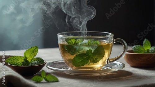 A steaming cup of mint tea with fresh mint leaves and a wooden bowl on a neutral colored surface