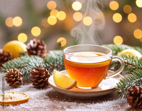 A steaming cup of tea with a lemon slice rests on a saucer. Surrounded by evergreen branches and pine cones, it sits atop a dusting of powdered sugar, evoking a winter scene.