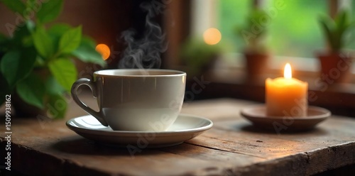 A steaming mug of herbal tea sits on a rustic wooden table next to a lit candle, creating a serene and calming atmosphere perfect for unwinding after a long day , restful, drink, candle