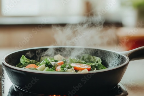 A steaming skillet with sautéed vegetables, featuring fresh greens and colorful tomatoes, set against a softly blurred kitchen background.