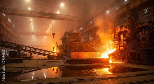 A steel mill with machinery and sparks in a foggy environment.