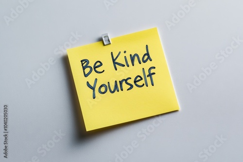 A sticky note featuring the phrase 'Be Kind Yourself' emphasizes the importance of self-care and compassion in a minimalist and motivational style.