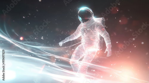 A striking astronaut in a luminous space, surrounded by dynamic streaks of light, symbolizing exploration, solitude, and the stunning beauty of the cosmos.