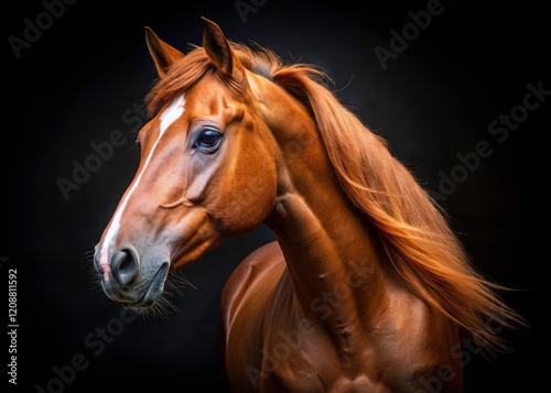 A striking chestnut horse, intensely captured in a close-up shot on a black background.