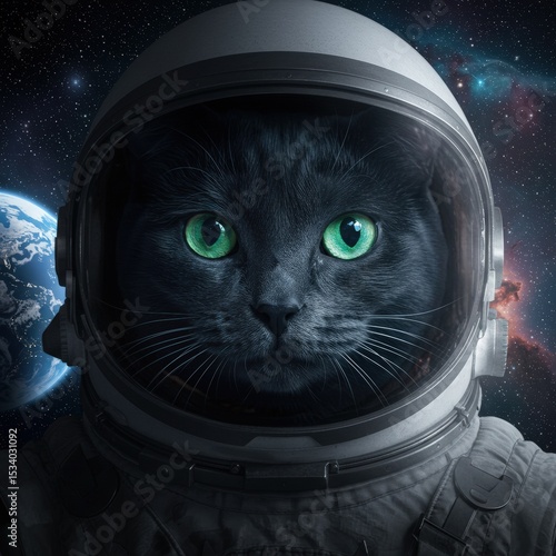 A striking close-up of a black cat in an astronaut suit, its piercing green eyes reflecting the vastness of space, with a vibrant nebula and a distant Earth