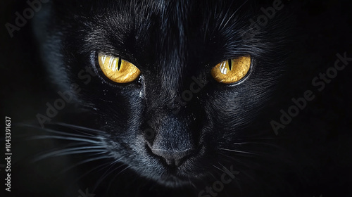 A striking image of a black panther with glowing yellow eyes, peeking out from the shadows. The contrast between darkness and the intense gaze creates a dramatic visual.