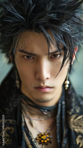A striking male model embodies a captivating character with intense expression