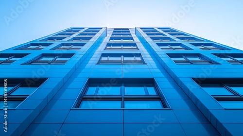 A striking upward view reveals the sleek blue exterior of a contemporary building, framed against a clear sky