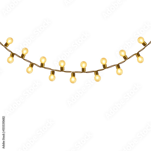 A string of glowing christmas lights with a gold wire on a black background in a horizontal line