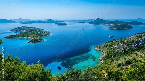 A stunning archipelago with small islands dotting turquoise waters under a cloudless sky