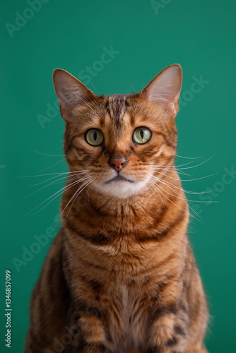 A stunning Bengal cat with a golden-brown coat and green eyes sits against a deep green background, gazing curiously with a regal expression.
