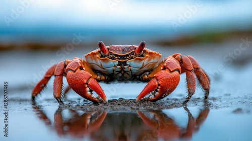 A stunning close-up shot of a beautiful red crab prominently displayed on a sandy shoreline, revealing its vivid colors and intricate shell patterns.