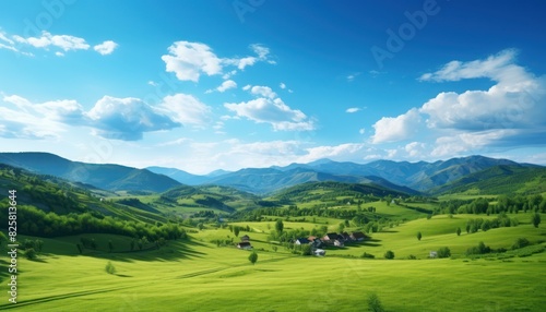 A stunning spring day landscaping views of fertile land surrounded beautiful green vegetation, wide stretches of hills and mountains with clear skies in spring