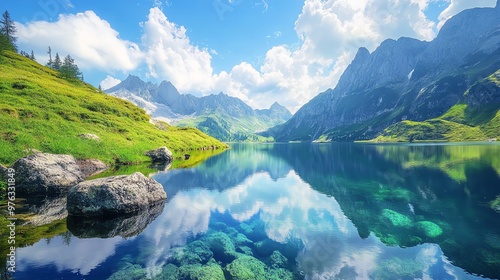 A stunning view of a crystal-clear mountain lake, with the surrounding peaks reflected in the water.