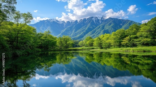 A stunning view of Kamikachiaes Azusa River reflecting the fresh green trees and the majestic Hotaka Mountains, creating a peaceful and picturesque landscape.