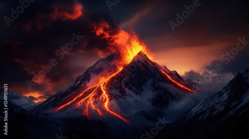 A stunning volcanic eruption at dusk, with molten lava cascading down a snow-capped mountain, illuminated by fiery orange and red hues against a dark sky.