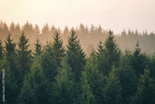 A stunning winter landscape during sunset where a dense forest of vibrant green pine trees with generative ai