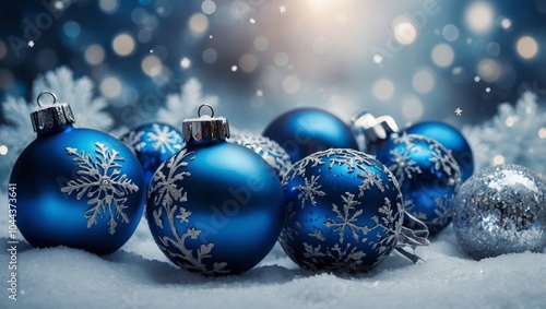 A stunning winter wonderland with a blue Christmas background, adorned with delicate snowflakes and sparkling Christmas balls. Generative AI