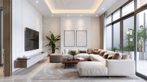 A stylish and contemporary living room featuring a large sectional sofa, modern decor accents, a flat-screen TV, and large windows letting in natural light.