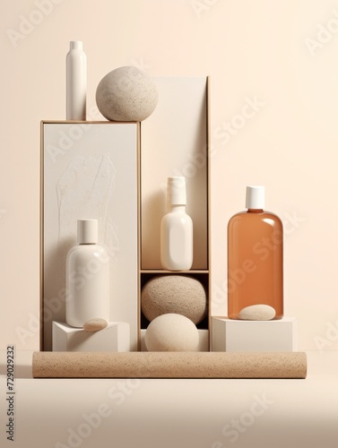 A stylish arrangement of beauty products with mirrors and balanced stone shapes, warm beige backdrop