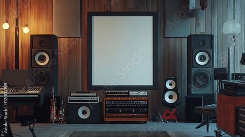 A stylish audio setup featuring speakers and a blank screen for presentations.