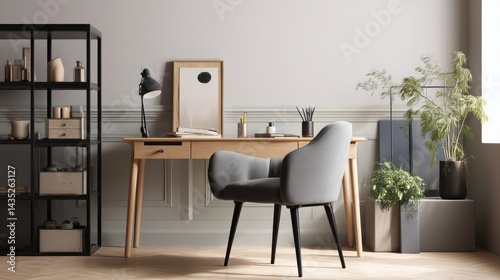 A stylish home office setup featuring a modern desk, comfortable chair, and decorative plants.