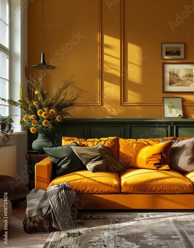A stylish living room boasting a modern design, featuring a vibrant yellow sofa against a rich green wall