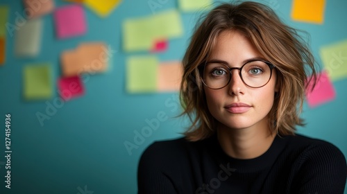 A stylish woman with glasses poses against a blue background adorned with colorful sticky notes, exuding creativity and thoughtfulness in her expression.