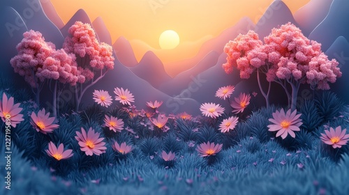 A stylized landscape at sunset featuring pink cherry blossom trees, daisy like flowers, and layered mountains against a warm orange sky