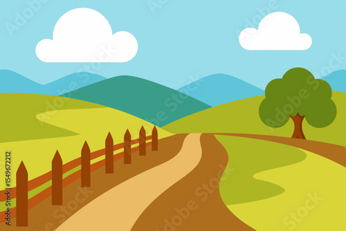 A summer landscape vector illustration features a road winding through green hills and a meadow under a sunny sky with clouds, offering a scenic countryside view