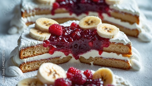 A sumptuous dessert with fluffy cake, banana slices, and berry jam layered between rich, creamy textures