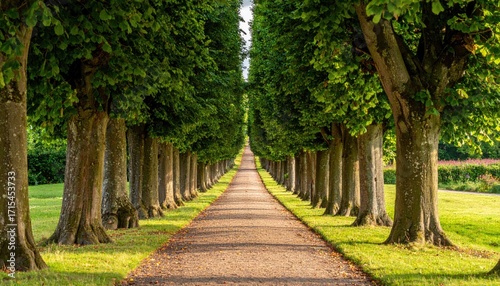 A sun-drenched avenue lined with tall, lush trees