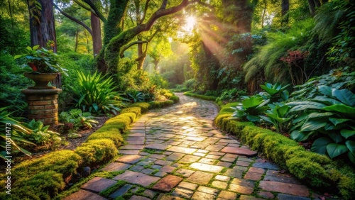 A sun-drenched stone path meanders through a lush, verdant garden, creating a tranquil and picturesque scene.