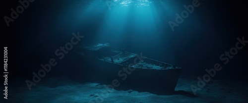 A sunken ship rests on the ocean floor, illuminated by beams of light from above.