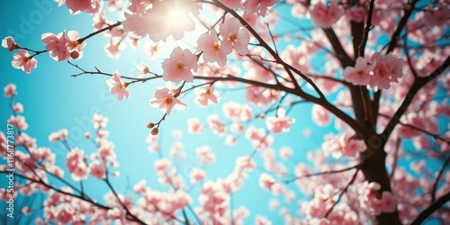 A sunlit springtime scene featuring a blossoming tree with delicate pink flowers, creating a vibrant and cheerful atmosphere.