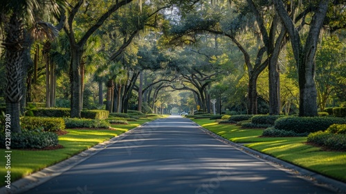 A sunny road lined with lush trees casts long shadows on the pavement. AI generative. .