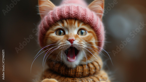 a surprised ginger cat in a knitted hat